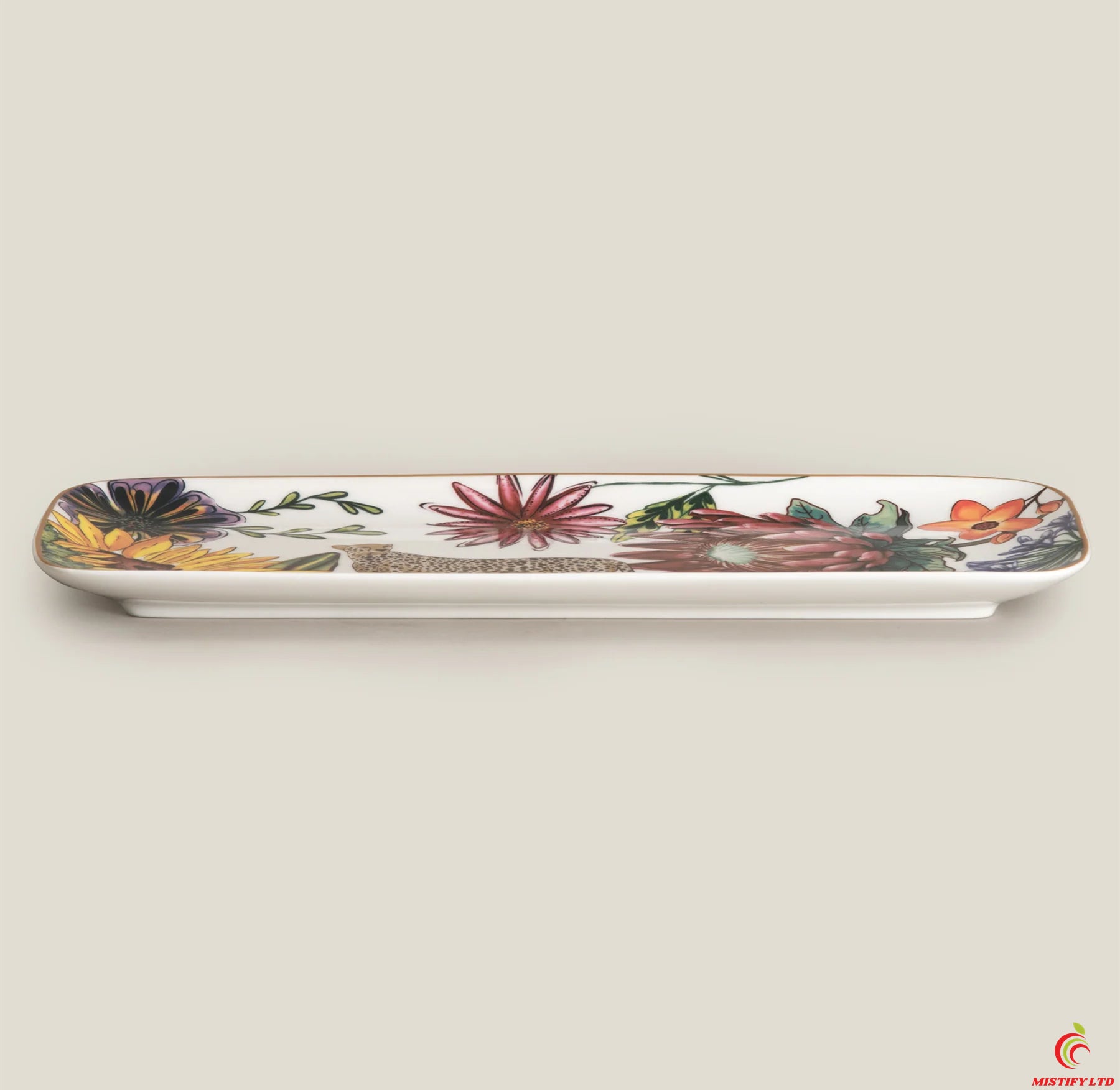 Add a touch of natural beauty to your banquet with our Cordero Platter. Celebrating life and art, it features large, colorful floral and lush botanical designs like cheetahs, sunflowers, and more. Crafted from premium bone china, this rectangular snack platter features rounded edges and gilded accents, making it the perfect choice for elevating any banquet.