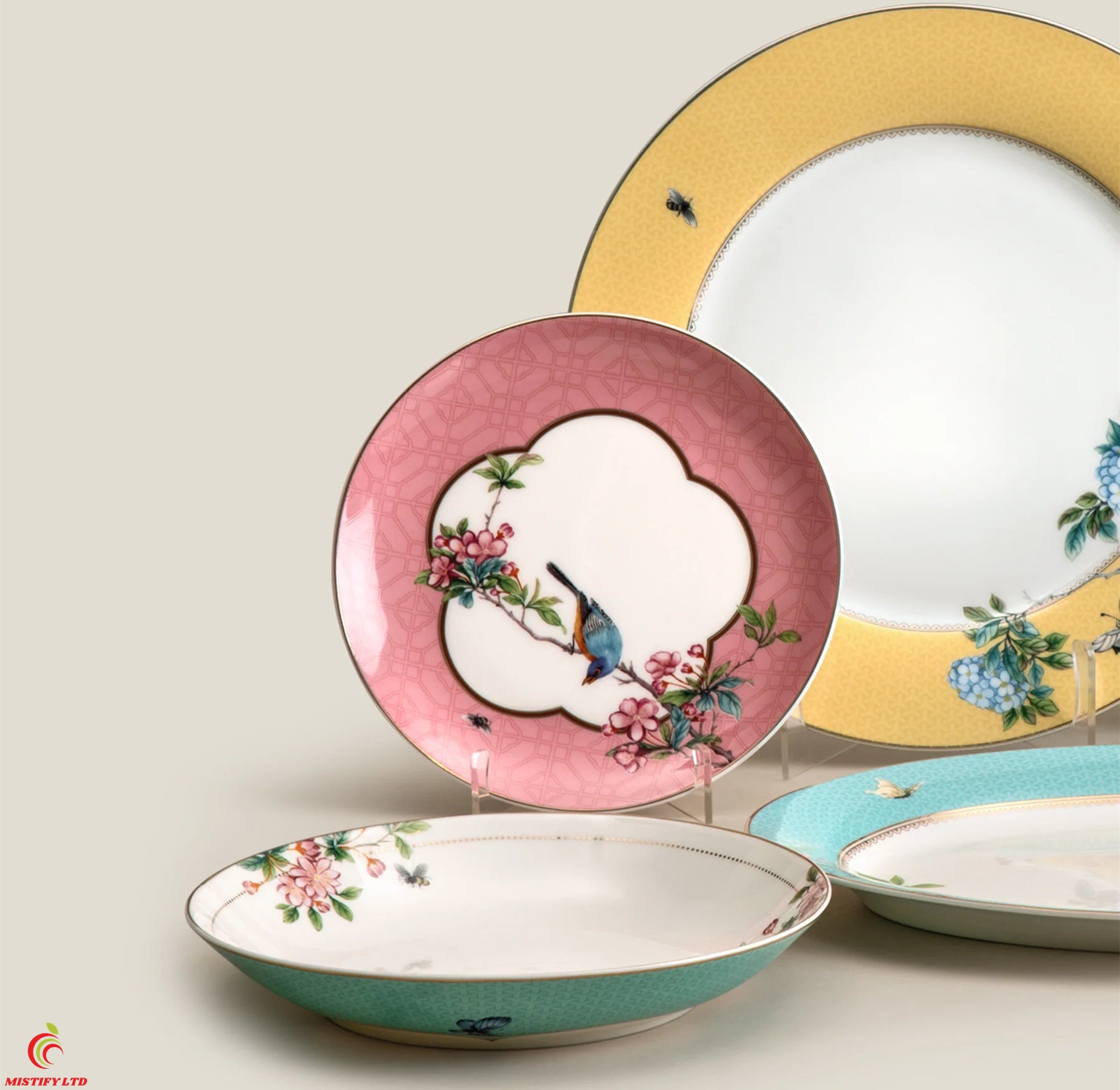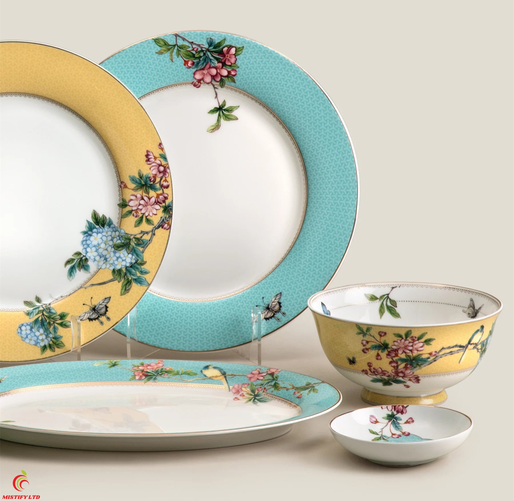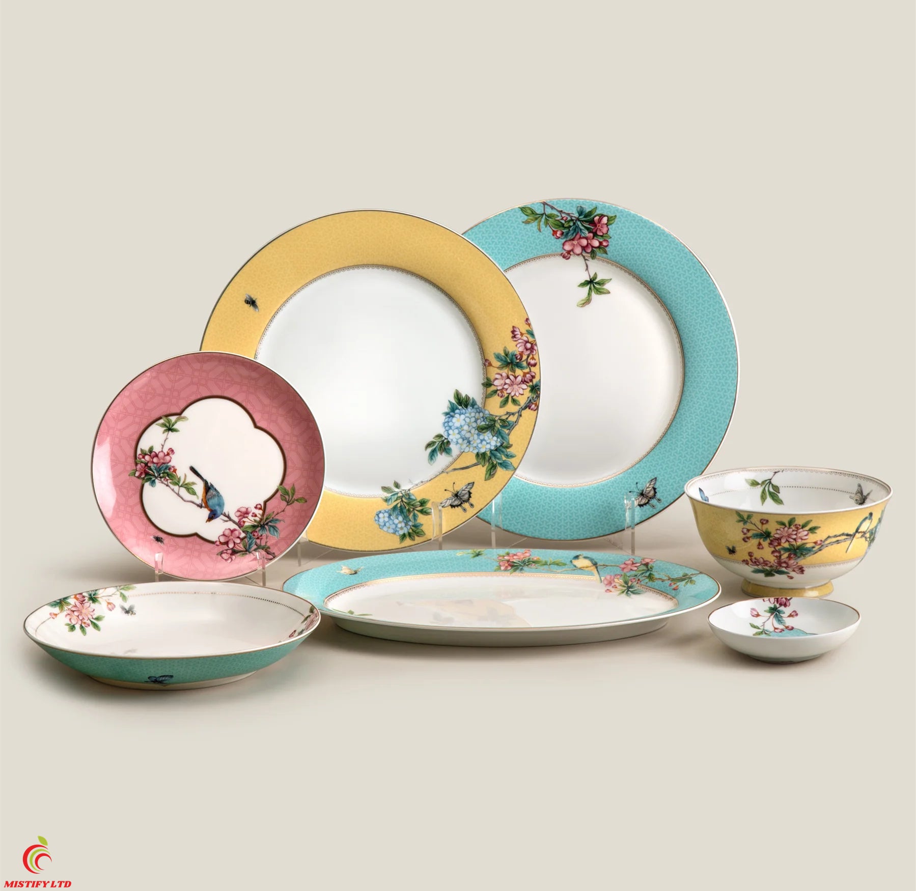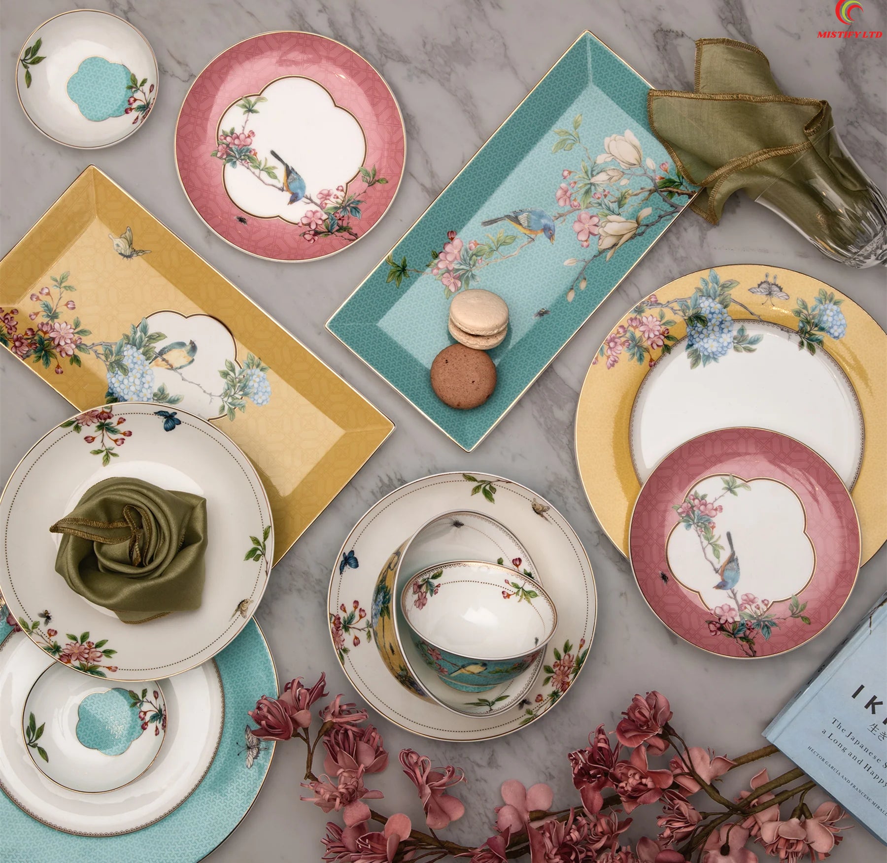 Inspired by Oriental art, this exquisite and elegant cherry blossom tableware set features floral branches, perched birds, and a geometric woven grid pattern. The soft, summery colors complement each other, creating a cheerful and elegant tablescape.