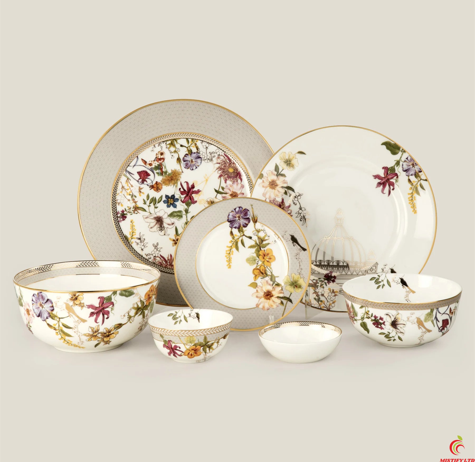 This 21-piece tableware set includes 6 dinner plates, 6 quarter plates, 6 serving bowls (katori), 1 medium bowl, 1 small bowl, and 1 round plate.