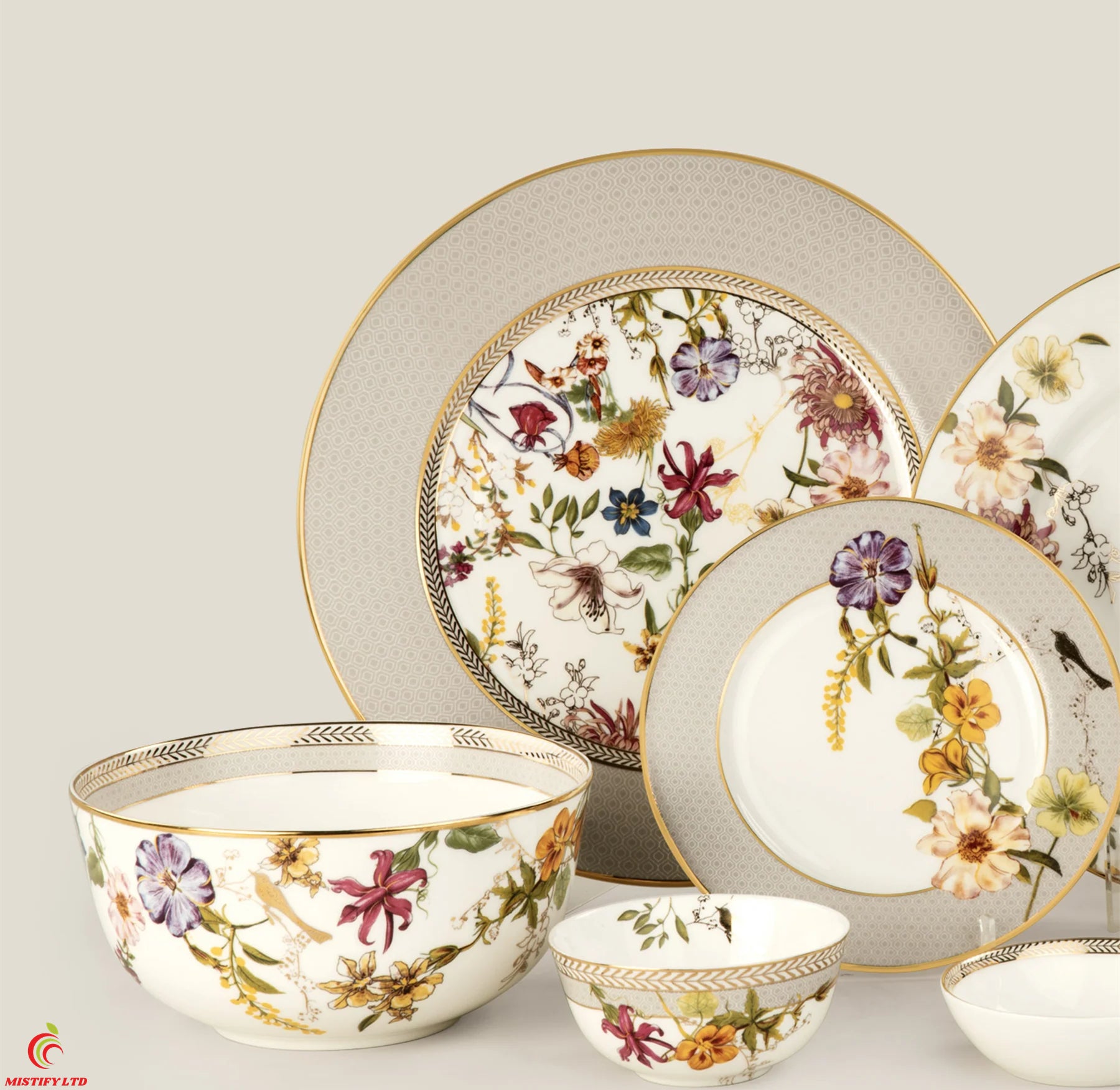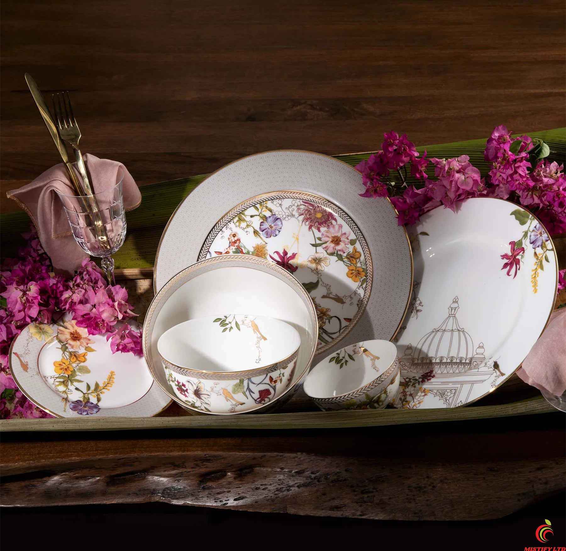 This colorful tableware set cleverly blends French floral motifs with Mughal architectural influences. Inspired by the vibrant colors of azaleas and other flowers, the refined and elegant tableware is ideal for outdoor dining.